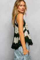 A breezy crochet tank with scalloped edges and a V-neckline, finished in black and natural colorblocking. The Black & Natural Border Weave Scalloped Crochet V-Neck Sleeveless Top has an open weave and relaxed silhouette that layers effortlessly over a cami or bikini. POL brings a handmade-inspired boho touch ideal for warm-weather weekends or beachside vacations. Lightweight and airy, it adds texture and artisan detail to casual outfits.