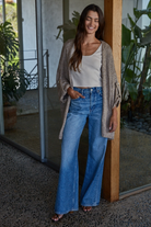 Knit Sweater Acrylic Cotton Polyester Folded Quarter Sleeve Open Front Cardigan
