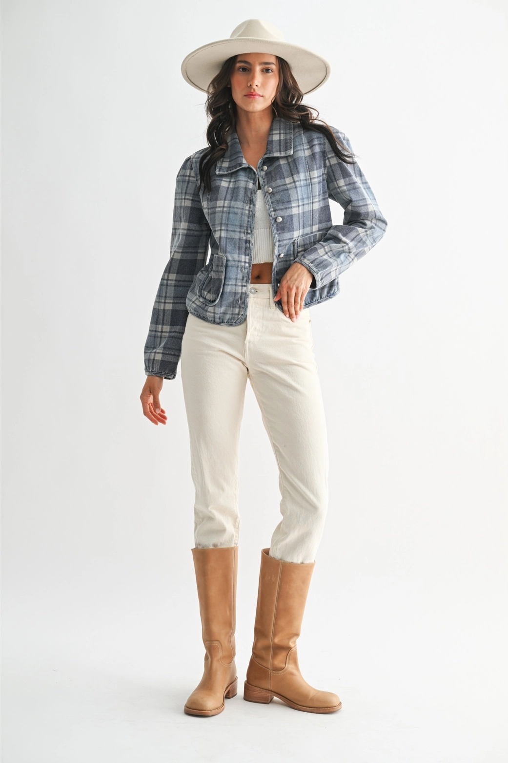 Elevate your wardrobe with this chic plaid denim jacket, perfect for casual outings and stylish layering. The timeless plaid pattern adds a classic touch, while the denim fabric ensures durability and comfort. Whether paired with jeans or a skirt, this versatile jacket is a must-have for any fashion enthusiast.
