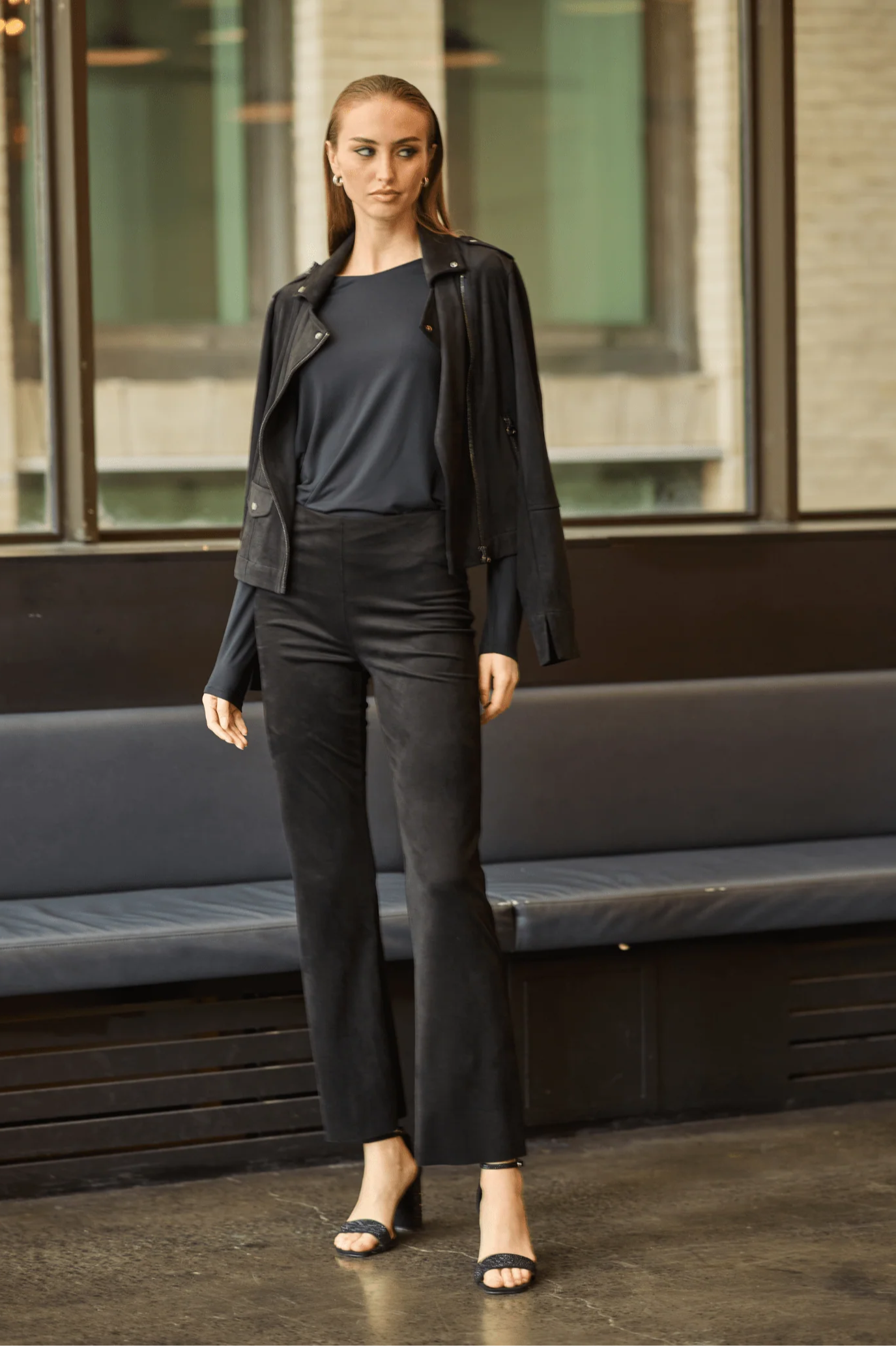 Made from stretchy Vegan Suede, the Jesse Vegan Suede Baby Boot pant offers pull-on styling, a concealed patented waistband, back yoke, studded back patch pockets and dyed-to-match top stitching. The Jesse Vegan Suede Baby Boot skims the hips and thighs before falling into an open bootcut leg and has a raw-edge hem for simple shortening.
