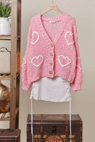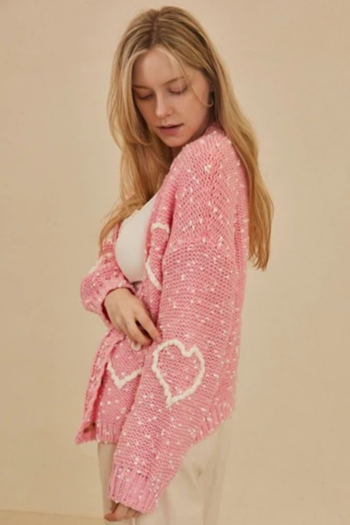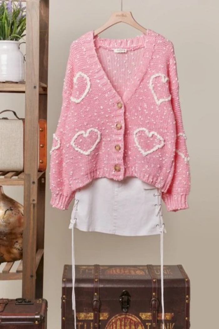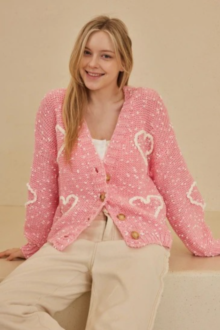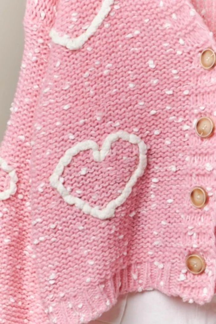 Cozy up in this perfectly pink Valentine button down sweater, detailed with sweet hearts!