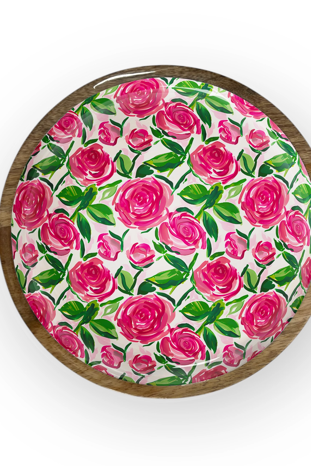 Brightly patterned and practical, the My Casita Roses 12" Round Serving Tray is perfect for serving appetizers or styling a tabletop. The tray features a vibrant pink rose print set in a round form with a wood-tone rim for a warm, casual look. My Casita brings a playful, garden-inspired aesthetic that livens up brunches and everyday gatherings. Lightweight and decorative, this tray works equally well for serving or as a centerpiece on a coffee table.
