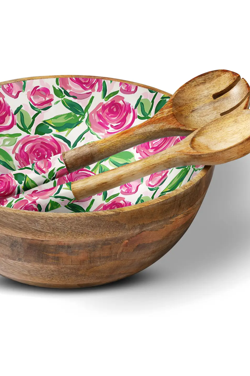 Bright floral liner and carved mango wood give this My Casita Roses 12" Salad Bowl cheerful style for tabletop entertaining. The 12-inch bowl has a hand-finished wood exterior and a painted rose pattern inside, perfect for serving salads or tossing greens. My Casita designed it to be both decorative and functional for casual dinners and gatherings.