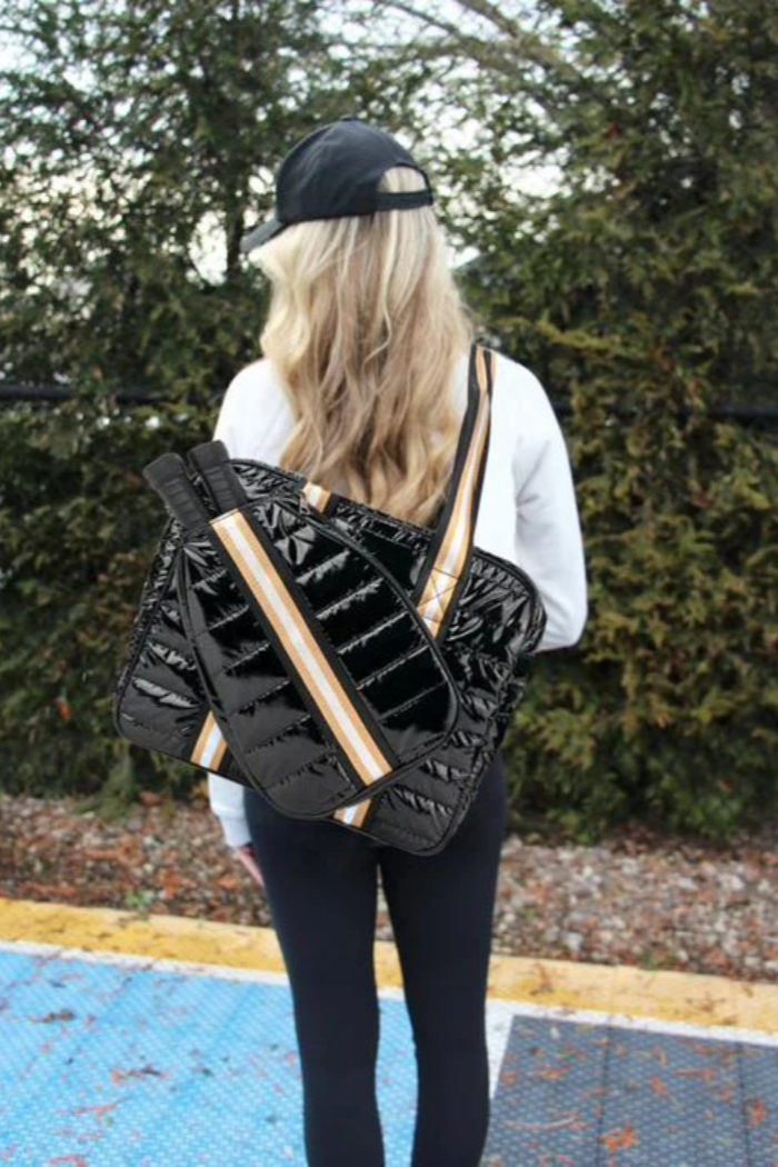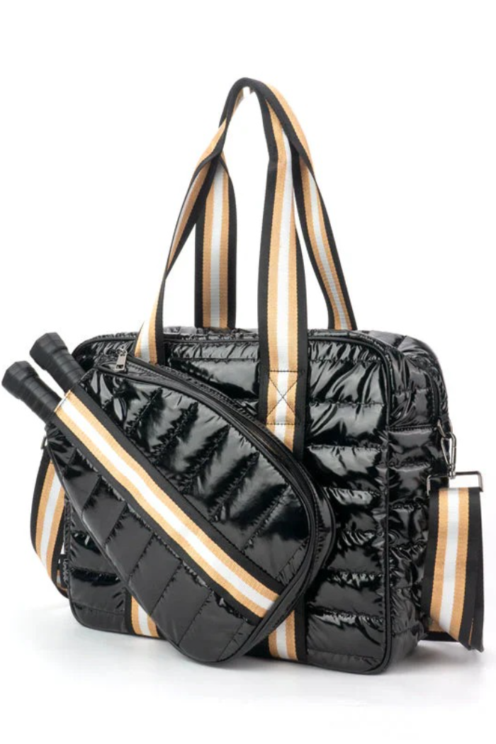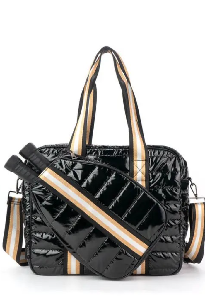 Game. Set. Style! Our new Lemonbella Signature Puffer Pickle ball tote is perfect for all day play. Adjustable, detachable crossbody strap.