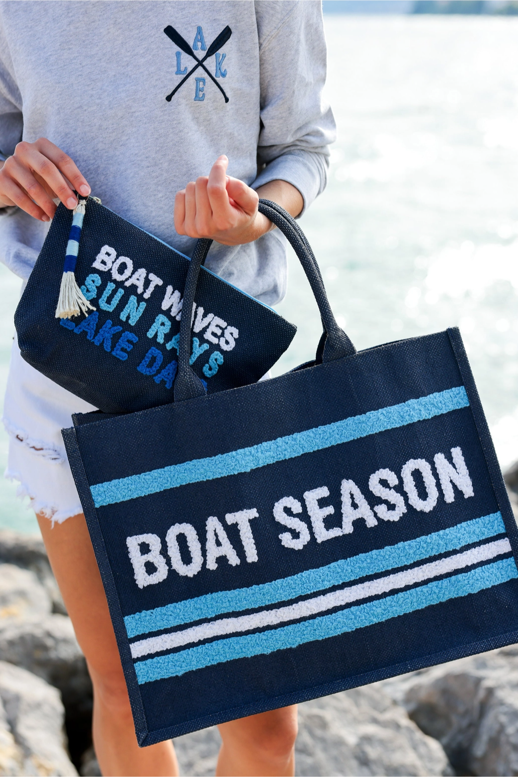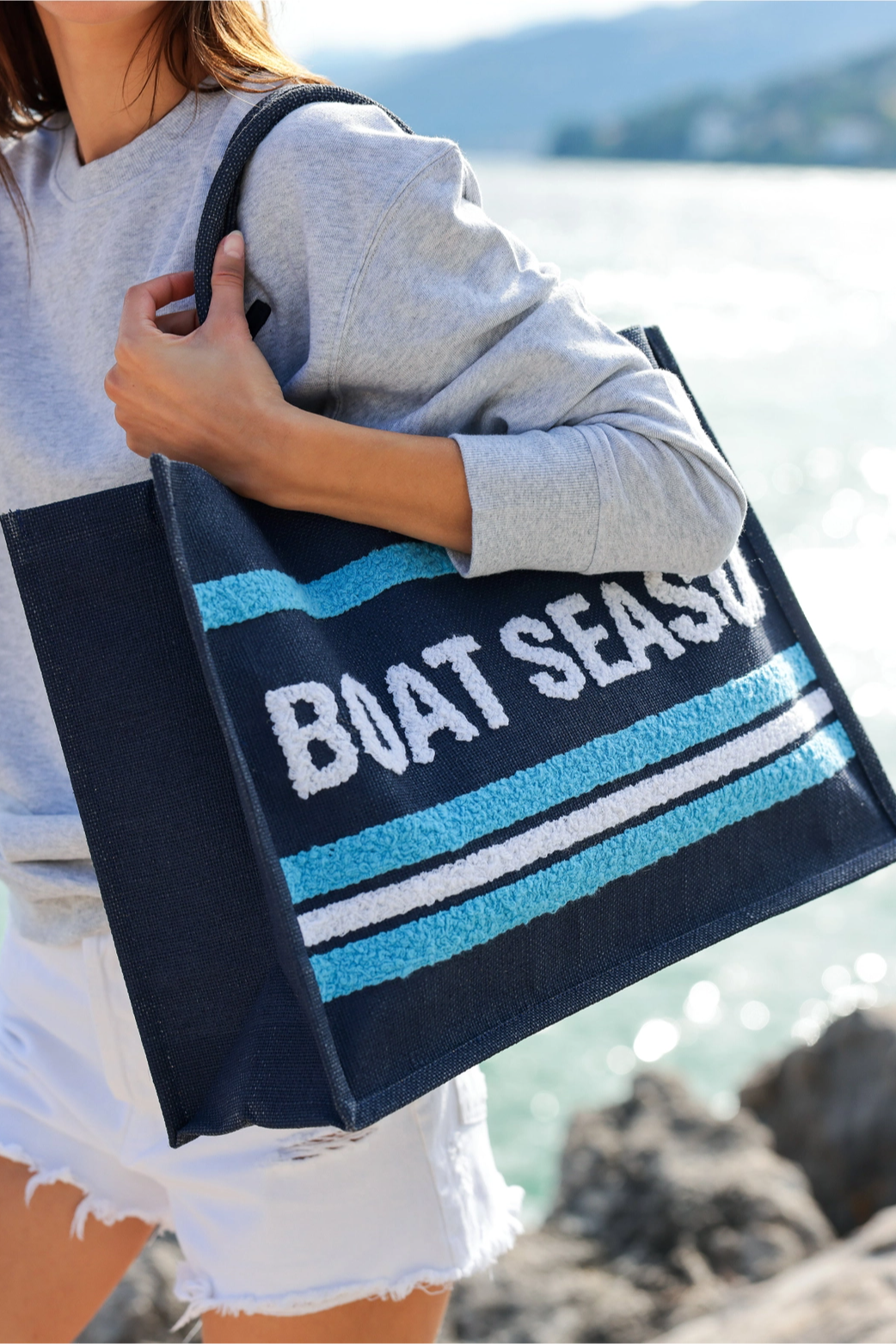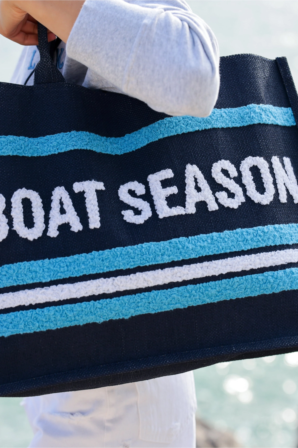 A roomy seaside tote designed for sunny days and waterfront weekends. The Shiraleah "Boat Season" Navy Beach Bag is crafted in a woven straw-like texture with bold turquoise and white stripes and rope-style handles for an easygoing silhouette. It's sized to carry towels, sunscreen, and everything you need for a beach vacation without fuss. The playful "Boat Season" text gives it a nautical, off-duty vibe that pairs well with casual warm-weather looks.