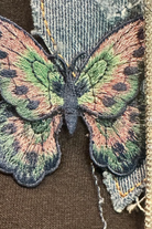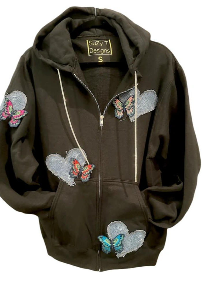 Cozy zip hoodie with vintage denim hearts & 3 dimensional butterflies, some with metallic thread! ---Crystal Rhinestone String has replaced the "regular" twine string! for a bit of added bling
