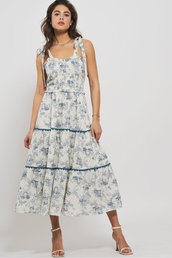 This romantic midi dress features a delicate blue and white toile print, a smocked bodice, and adjustable tie shoulders for a feminine silhouette. The three-tiered skirt with scalloped trim and high-low hemline is accented by navy piping, making it perfect for garden parties, weddings, or summer occasions.
