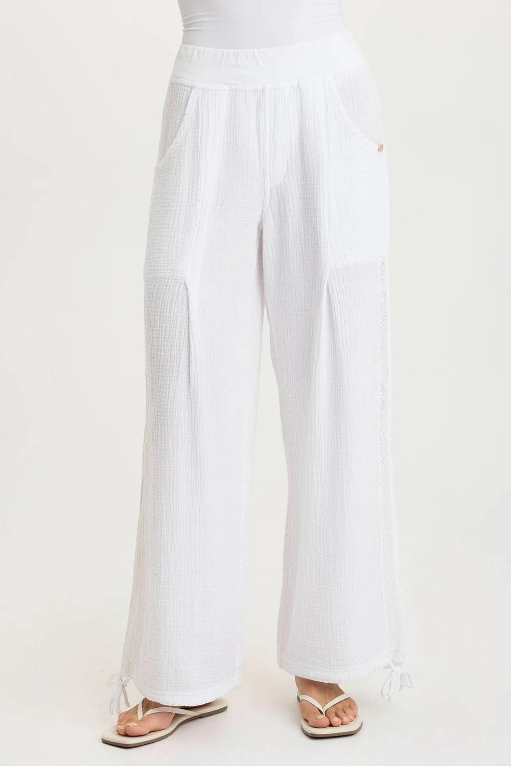 wo pleats adorn the front leg panels on this mesh trimmed, cinched leg opening pull-on pant. Lenka also has two front pockets and two back welt pockets.